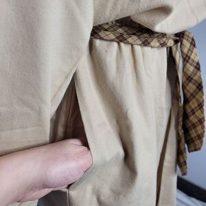 Vtg 1970s/1980s plaid collared tie waist button up khaki shirt dress with pockets. Great neutral colored dress you can pair with any color. Plaid tie belt and plaid under the collar. There is pilling throughout and a small stain within the pleats, it has not been treated. Marked a size 10 but fits more like a small. Please refer to measurements. Polyester cotton.