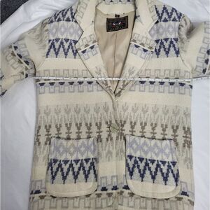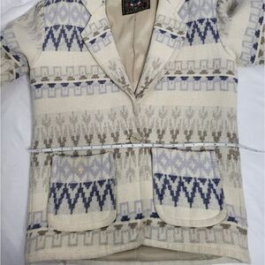 Vintage 1990s Express southwestern print oversized one button peacoat jacket. Two very small spots and some tearing on the inner lining. Rare find! Marked a size XS but fits more like a M, please refer to measurements.