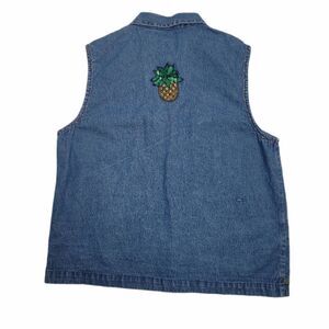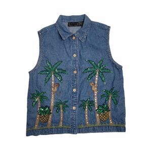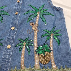 Vtg 1990s Life Style sequined monkeys with palm trees sleeveless button up jean top. Small flaw on one of the monkeys and a tiny hole on the back. Pineapple applique on the back. Great summer top. Cotton