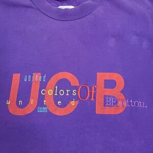 Vtg 1990s United Colors of Benetton purple single stitch embroidered logo boxy t-shirt. Some faint surface spots shown in photos. Rare brand tee! No size tag, please refer to measurements. Unisex fit.