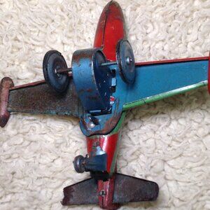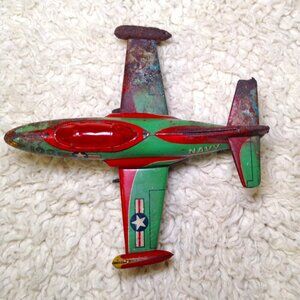 VINTAGE/ANTIQUE Litho Korean War Friction Tin Toy, Barn Find; Navy Fighter Jet, Veteran, Collectible. Navy VF721 Plane, #126. Great collectible for the beginner. 7" long, 7" wingspan. Good condition; In perfect condition these run approx. $275.