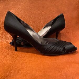 VINTAGE BLACK SATIN SALVATORE FERRAEGAMO PEEP TOE KITTEN HEEL PUMPS EUC