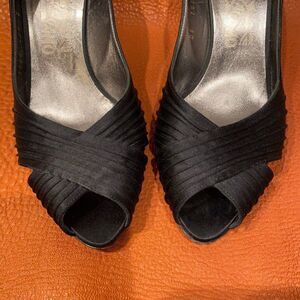 A GORGEOUS Vintage Salvatore Ferragamo Black Satin Criss Cross Gathered Fabric Peep Toe Kitten Heel Pumps in Great Vintage Condition!