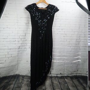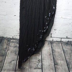 BLACK SEQUIN AND BEADED CAP SLEEVE V NECK GOWN WITH UNIQUE HEMLINE UNKNOWN DESIGNER SIZE SMALL GENTLY USED A FEW BEADS ARE MISSING SHOWN IN PHOTOS BUT YOU REALLY HAVE TO LOOK TO FIND THEM. BOTH ARE ON THE BACK ONE BELOW THE LEFT ARM AND THE OTHER BELOW THE BUTT LINED SHOULDER PADS