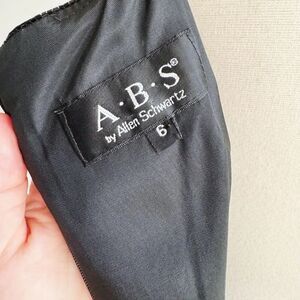 Elegant and timeless vintage evening gown by A.B.S. by Allen Schwartz. Features a classic trumpet silhouette with a square neckline, fitted bodice, and subtle bead detailing along the seams for a touch of shimmer. The dress has a long, flowing hemline perfect for formal events or black-tie occasions.
