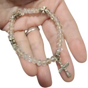 stretch beads beading cross crosses glass clear etched metal embossed metallic casual cottage core girlhoodcore coquette girl feminine white clear silver retro boho bohemian party travel vacation resortweae charm bracelet charms
