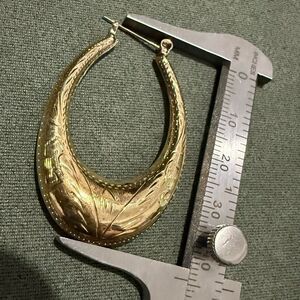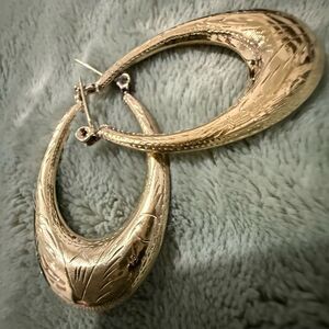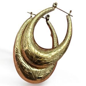 Striking vintage-style gold-tone earrings with a beautifully engraved floral pattern. These statement pieces are shaped like elegant half-moons (crescent hoops), slightly puffed, with textured etching that reflects light from every angle.