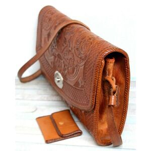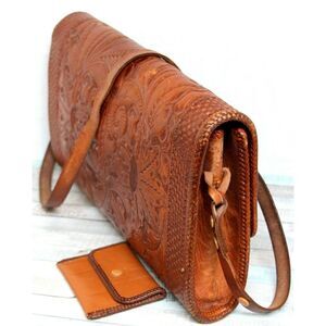 VINTAGE HARKNESS BUILT TOOLED TAN GENUINE LEATHER SHOULDER BAG HANDBAG PURSE