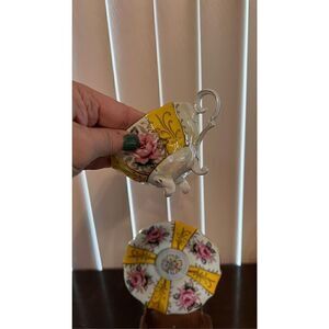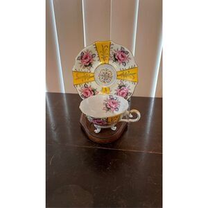 VINTAGE IRIDESCENT YELLOW TEA CUP AND SAUCER WITH ROSES