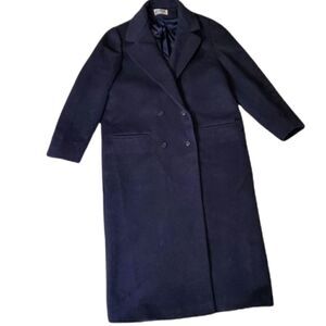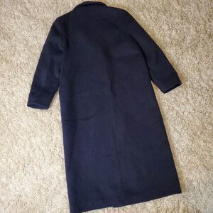 Excellent pre-loved condition. Navy blue 100% wool heavyweight coat with attached satin lining. 1 small hardly noticeable flaw in the lining as seen in the pics. Lightly padded shoulders. No missing buttons. 2 front pockets. Beautiful vintage condition. Smoke free home. This coat is gorgeous! Made in thr U.S.A.
