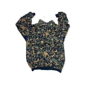 VINTAGE 1990s Derotchild Zip up silk jacket. This has a black drawstring around neck to get a closer fit. Closure is a black zip pull. There is black and gold cording beside the zipper. There is a floral pattern against a black background.