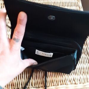 It has some discoloration on the back as shown. This is reflected in price. Inside looks like new! Otherwise in good pre owned condition. Still has lots if life left! Perfect small dressy bag that has a long strap to be worn as a crossbody or clutch.