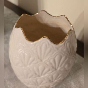 Enhance your home decor with this elegant cream vase featuring a luxurious gold trim. Perfect for adding a touch of sophistication to any room.
