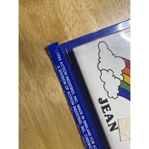 Measuring small in size, the rectangular plaque was manufactured in the late 20th century by Action Industries in the United Kingdom. It is an original piece and customized with your name "Jean". The plaque is designed to be hung horizontally and comes with a unit quantity of one. Bring some art and color to your space with this name plaque. Please understand this is a vintage item and the self adhesive may not work as well as it did in the 80's and may need additional support to be hung.