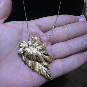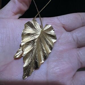 Pendant necklace approx 30" (14 2/3" drop)- see photo - Leaf motif has matte and shiny gold tone finish - backside is matte finish - chain is shiny gold tone with lobster clasp and Monet logo - Excellent preowned condition