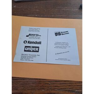 Original vintage NASCAR driver card or promo card featuring the #81 yellow and white Pontiac sponsored by Jasper Engines & Transmissions. Printed on medium cardstock with blue background Across the windshield it reads “Lewis.” Upper left corner identifies it as a Tommy Lewis Racing promotional piece, with full team and sponsor details, including Kendall, Unijax, Maurice Vaughan Inc., and Dynamic Graphics. Card measures approximately 6" x 9". Reverse side includes printing business info from Dynamic Graphics, Charlotte, NC