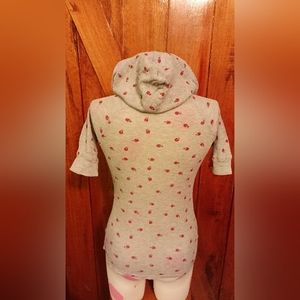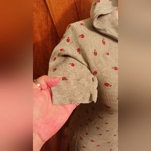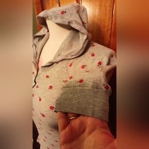 **VINTAGE** This hooded (3) quarter steeve top is Earl grey w/ lady bugs all over & has a button up closure on the chest in excellent condition! super cute top!soft & stretchy 60% cotton & 40% polyester RN# 78749 MEASUREMENTS: from shoulder to bottom hem is 21 1/2 in. & waistline laying flat straight across is 12 in. wide