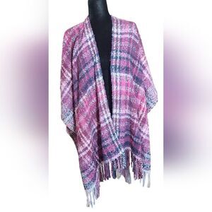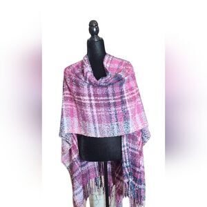 This gorgeous tweed wrap is breathtaking. The colors are so rich and form a aoft plaid pattern. The yarn is also very soft and warm. This piece is essential to an elegant wardrobe and is perfect for any occasion where you wish to wear it!