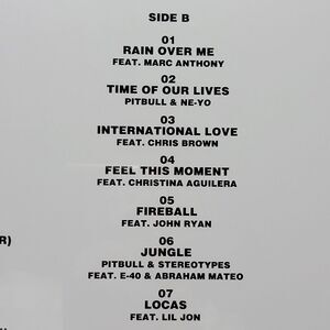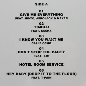 Tracks Include: "Give Me Everything", "Timber", "I Know You Want Me (Calle Ocho)", "Don't Stop the Party", "Hotel Room Service", "Hey Baby (Drop It to the Floor)", "Rain Over Me", "Time of Our Lives", "International Love", "Feel This Moment", "Fireball", "Jungle", and "Locas".