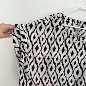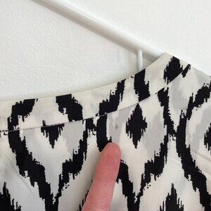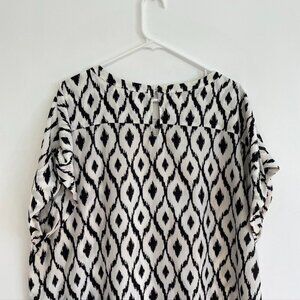 - white (may be slightly off white (hard to tell)) / black ikat geo geometric print crew ish round ish neck short dolman sleeve blouse top