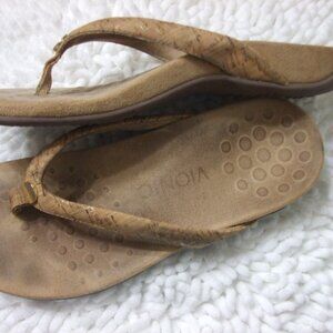 Tan cushioned straps in a corkboard kind of pattern with a gold embellishment. Shows footbed wear but otherwise in great shape. Size 8.