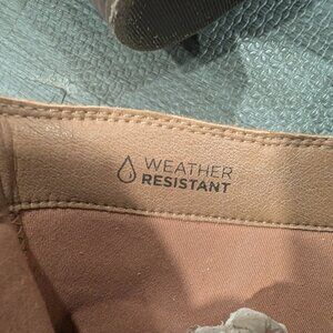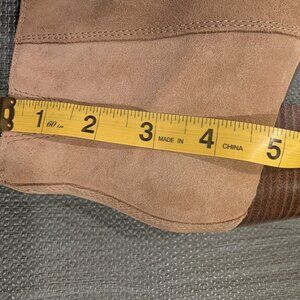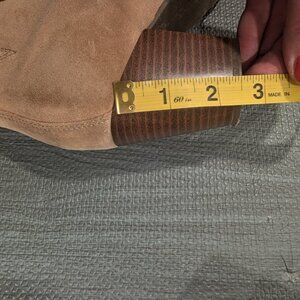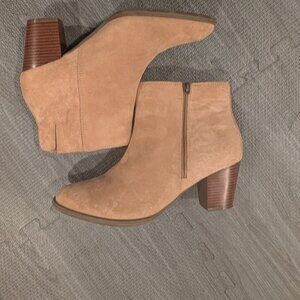 Vionic camel-colored suede booties with side zip, size 10. 2 1/2" block heel, almond-shaped toe. Minimal wear, suede is in great condition. Neutral color, goes with just about everything and suede is big. No major stains or water marks; weather-resistant protective layer.