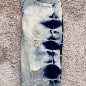 Size 1/25 manufactured distress and obvious signs of wear but super cute make your butt look cute and have nice stretch to them skinny and snug length is about 30” faded light blue wash.