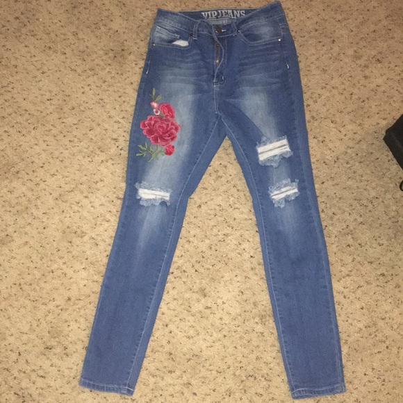 ripped jeans with red roses on right leg/still in good condition but i took off the tag