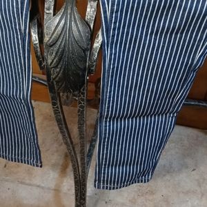 A quality cotton material thick blue and white striped has belt loops cut small