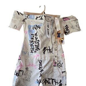 VIP Jeans Graffiti Print Romper Size 2x Women White & Multicolor Short Sleeve