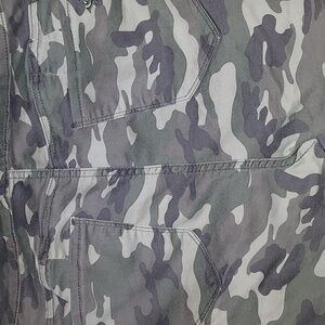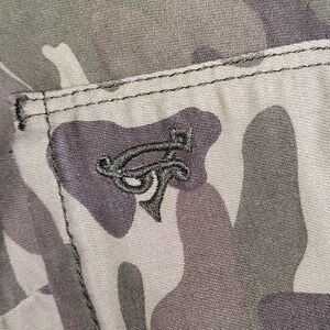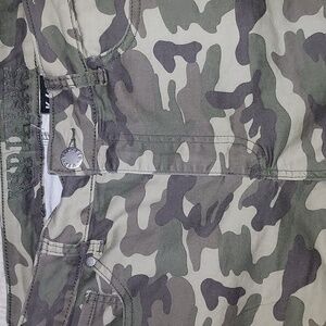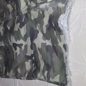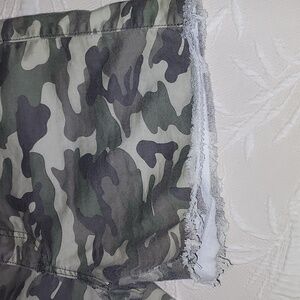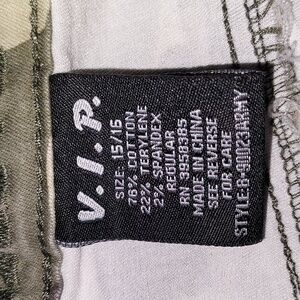 Size 15. Camouflage greens. 1 button zip front closure. Belt loops. 4 pockets. Frayed hems. Like new. Waist 16.5 ". Rise 10.5 ". Inseam 4.5 ". Leg opening 10".