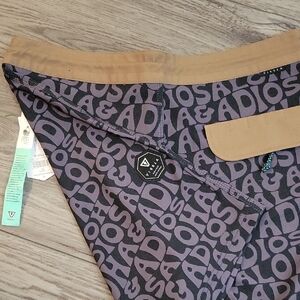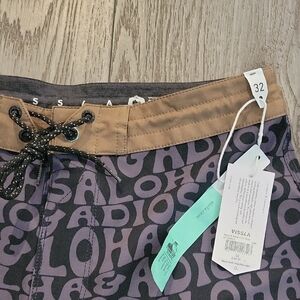 Stylish VISSLA board shorts with bold lettering. Features black and tan colors. Perfect for beach adventures.