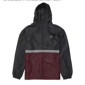 Oversized lightweight sturdy windbreaker jacket by VISSLA. Water resistant. Mesh lined. Full zip front. Hooded. Burgundy and black Colorblock with 7 stripe screen printing detail. Great condition. Youth size small but fits like a big boys small (10/12).