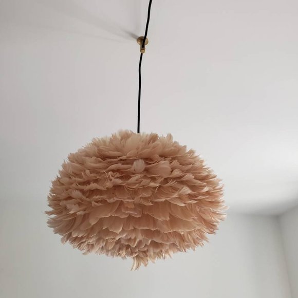VITA feather lampshade for ceiling or floor. Brown/Pinkish. Medium size 30 cm x 45 cm (17.7 in, x 11.8 in.). In good condition. Some tears but not noticeable when installed. Sells for 260, but price negotiable due due to the tear. Sustainable geese feathers. https://www.dowsingandreynolds.com/product-tag/vita/