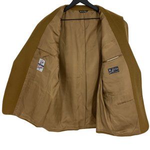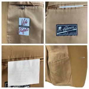 Description: The Vito Rufulo Sport Coat is a single breasted coat with blend of wool and cashmere. This sport coat has a wide notch lapel, padded shoulders, breast pocket, nonfunctioning straight front pockets, long sleeves including nonfunctioning sleeve buttons. Interior lining for body and sleeves with button closure pocket and two left pockets.