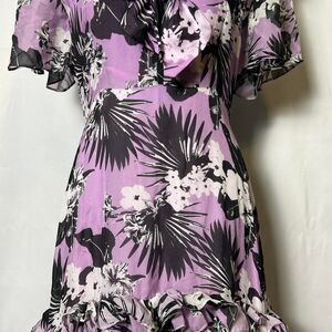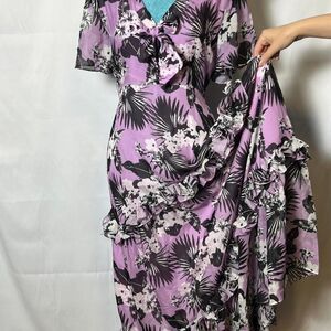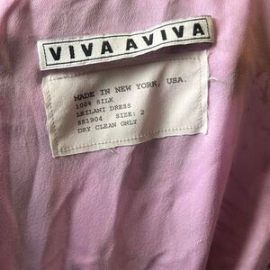An absolutely showstopping designer dress from Viva Aviva. ๐ This stunning piece, the "Leilani" dress, is crafted in New York from 100% pure silk. The fabric is a lightweight, airy chiffon that flows beautifully, featuring a romantic tropical floral and palm print on a lavender background.