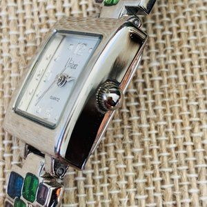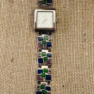 This watch reminds me of springtime! The stones are beautiful shades of blue, lavender and green. Stainless steel case with Japan movement.