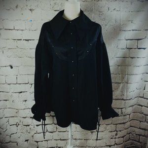 Designer Vivienne Hu stunner can be worn as a top or jacket. Heavy weight button up blouse featuring ruffle sleeve cuff, button fastening, and gold stud details. Actual top for sale is all BLACK💖... Illustrations in brown color way as a reference for design.