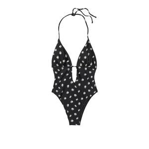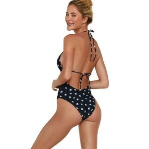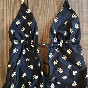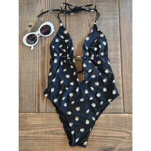 VIX Sally Eliza One Piece Swimsuit - Size Small - Black w/ White Daisy Floral Print - Halter Plunge Neckline - Cheeky Bikini Style Bottom- Gold Logo Emblem - Open Back - Sexy - Designer - Luxury Swimwear- Paula Hermanny - Boho - Resortwear- Beach - Pool- Vacation Swimsuit - Summer - Glasses available in our store