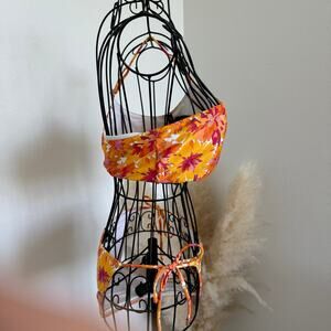 A vibrant floral print brightens a bandeau bikini top fashioned with a single strap for chic style. This traditional tie side bottom with elevated gold detailing and elastic cords with a curve hugging fit giving you an alluring look.