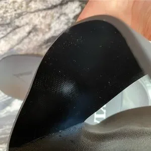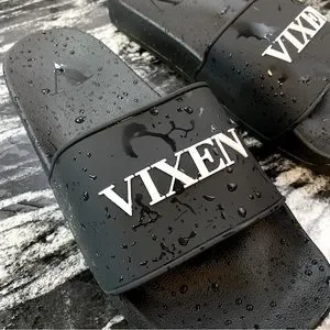 Unworn and brand new, these Rubber Vixen slides in black with white lettered decal are a statement piece you'll love. Unfortunately, they were gifted in the wrong size—size 43. Give your feet a stylish treat with these trendy slides that are ready to step up your fashion game.