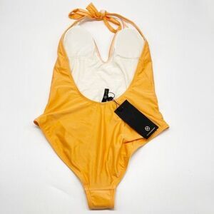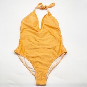 DESCRIPTION: Solid orange; deep v-neck; Halter; one piece; self-tie halter straps; lined; moderate coverage; hand wash; 75% polyamide, 25% elastane