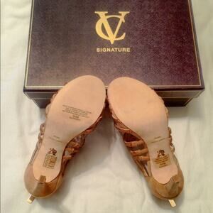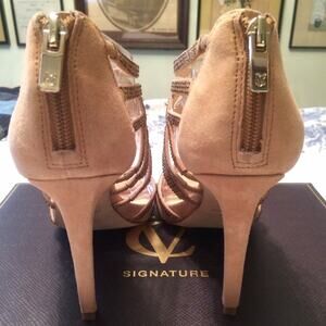 VC Vince Camuto Signature Brigitte tawny tan suede and rhinestone embellished strappy heels. Size 6M