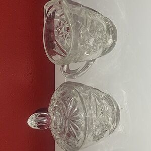 Vintage Anchor Hocking Early American Prescut (EAPC) Star of David sugar bowl with its lid and a matching creamer.