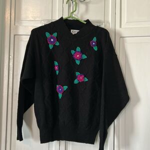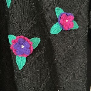 Vintage black knit sweater with crochet flower applique in magenta and purple - 3-D!  Lightweight acrylic yarn - a perfect weekend casual look.