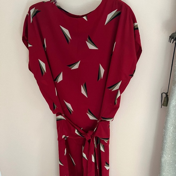 Vintage Popi Cranberry Dropped-Waist Geometric Print Dress with Sash, Sleeves Meld into Dress, Geometric Print of Green, Black, and White Triangle Shapes, Dry Clean Only, Size 9/10.
