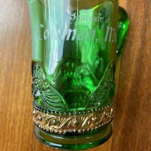 Green glass with "Souvenir of Coleman, Mich." embossed on it. Gold trimat top and at bottom