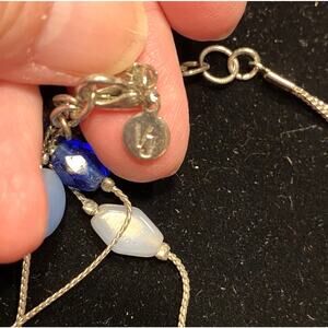 Beautiful multistrand beaded necklace by Victoria Jousan - blue tones and a variety of art glass beads makes this a unique and truly stunning fashion accessory. Perfect for any occasion - the silver tone chain allows for the beads to float at collar length for a lovely romantic look. Clearly hallmarked - sturdy lobster clasp - wonderful sparkle on the beads. Gently worn - no flaws - so pretty!