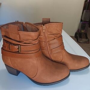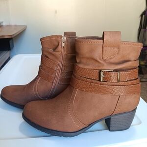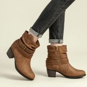 VJH comfort mid calf boots for women, small chunky block heel, size 8, super comfy and warm, buckle fastening, side zipper makes it easy to put on and take off, round toe, rubber sole designed with low heel and anti-slip, high quality leather-like material, breathable suede insole padded with high-density memory foam, reduce foot fatigue, used 1 time, good condition and clean.