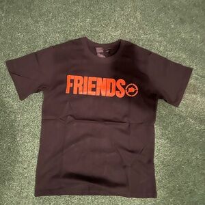 Black VLONE t-shirt with bold orange 'FRIENDS' print. Casual and stylish.